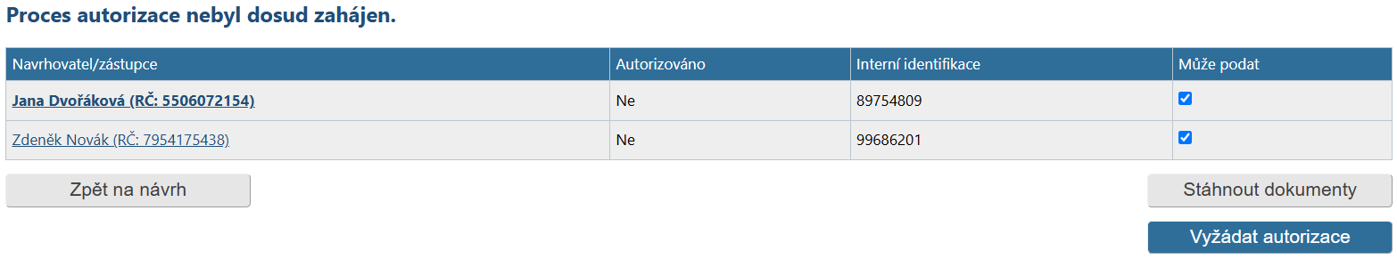 Je-li v návrhu více navrhovatelů/zástupců, je nejprve potřeba proces autorizace pomocí tlačítka Vyžádat autorizace zahájit: