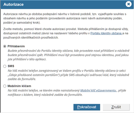 Dostupnost autorizace pomocí Mobilního klíče eGovernmentu závisí na tom, zda máte ve Vašem profilu v Identitě občana připojenu aplikaci Mobilní klíč eGovernmentu.