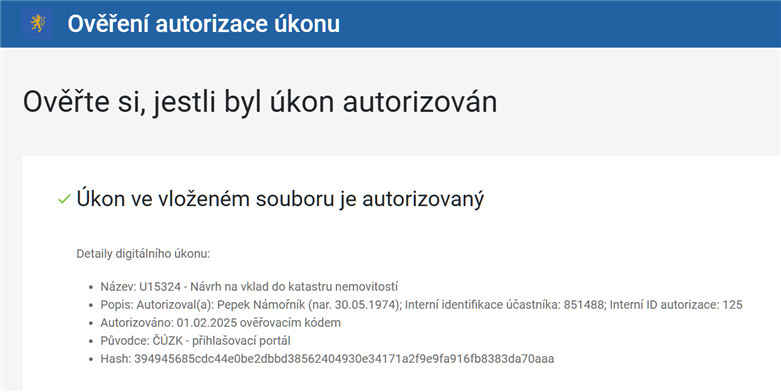 Po provedení autorizace lze kdykoli zpětně ověřit, zda a kým byla autorizace provedena. Ověření se provádí na stránce dostupné na adrese https://www.identita.gov.cz/Autorizace/OvereniUkonu vložením PDF dokumentu s návrhem na vklad. Po vložení souboru se zobrazí všechny autorizace, které byly k příslušnému PDF dokumentu provedeny: