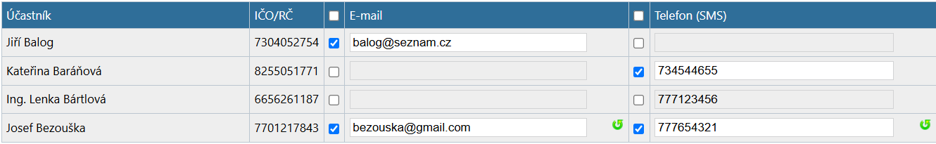 Pokud mají někteří účastníci u sebe zadán kontaktní e-mail nebo telefon (zadává se na stránce pro editaci údajů účastníka, viz např. fyzická osoba), může vypadat tabulka takto: