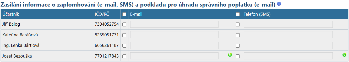 je k dispozici pouze u políček, kdy má účastník ve svých kontaktních údajích uveden e-mail nebo telefon (ve výše zobrazeném příkladu má kontaktní údaje vyplněn pouze Josef Bezouška) a stisknutím této ikonky doplníte kontaktní údaj do tabulky pro zasílání informací o zaplombování nemovitostí a automaticky se označí i políčko před tímto údajem.