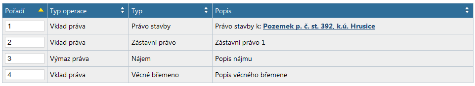 Jakmile změníte pořadí jednotlivých práv a stisknete tlačítko Uložit a zavřít, zobrazuje se seznam práv ve zvoleném pořadí a ve stejném pořadí se pak práva objeví ve výsledném souboru s návrhem na vklad.