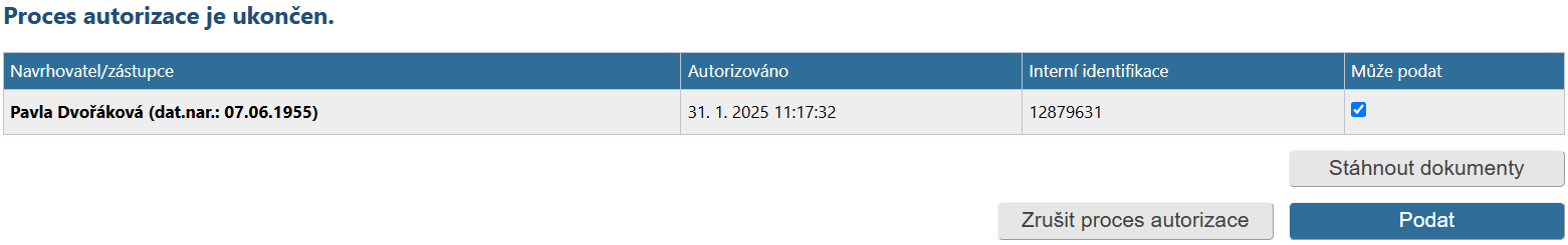 Pokud uživatel v tomto okamžiku zjistí, že potřebuje v návrhu udělat změnu, může celý proces autorizace zrušit pomocí tlačítka Zrušit proces autorizace, vrátit se na návrh, provést změny a podat návrh online znovu. Všechny autorizace musí být znovu provedeny!