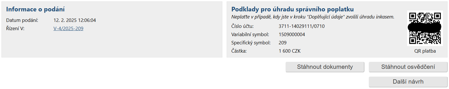 Po kliknutí na tlačítko Podat je podání odesláno na katastrální úřad a zobrazí se informace o přiděleném čísle řízení V a podklady pro úhradu správního poplatku: