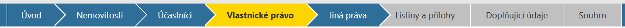 Šedá - kroky, kterými jste buď ještě neprošli, nebo kde jste už zadali údaje, ale vzhledem ke změnám, ke kterým došlo v předcházejících krocích, nejsou tyto údaje ověřeny. Na tyto kroky není možné kliknout. Dostanete se k nim postupně, prostřednictvím tlačítka Následující na stránce, nebo klikáním na následující nejbližší krok v záhlaví.