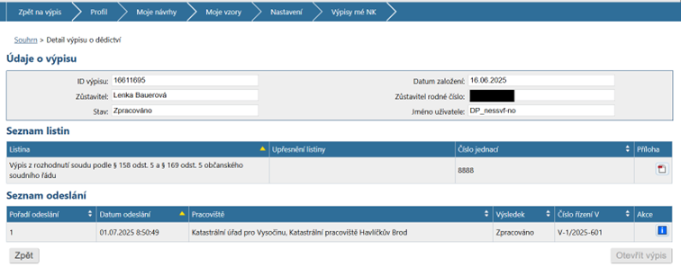 ve sloupečku Akce se dostanete na stránku s detaily výpisu. Na této stránce je souhrn informací o výpisu včetně seznamu listin a jejich příloh, které si můžete případně stáhnout k sobě do počítače, a včetně informací o odeslání výpisu na příslušná katastrální pracoviště. Na obrázku je příklad informace o úspěšně zpracovaném výpisu: