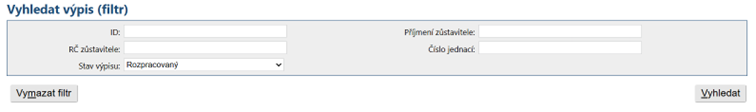 RČ zůstavitele - slouží k vyhledání výpisu podle rodného čísla zůstavitele. RČ musíte zadat přesně.
