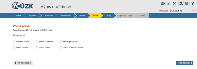 Na stránce jsou jednotlivé možnosti pro zapisované právní vztahy nabízeny formou zatržítek (check-boxů). Ve výchozím stavu je vybrána možnost „Vlastnictví“. Uživatel má možnost navolit libovolnou kombinaci nabízených právních vztahů. Alespoň jeden právní vztah musí být vybrán.