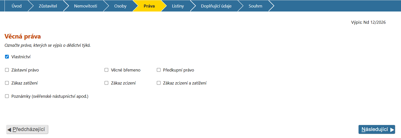 Pokud se chcete vrátit o krok zpět (na krok "Osoby") stiskněte tlačítko nazvané Předcházející, umístěné v levém dolním rohu obrazovky.