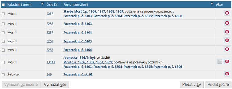 Ze seznamu je rovněž možné libovolné nemovitosti odstranit. K tomu se dají využít ikonky s křížkem ve sloupci „Akce“, případně tlačítko Vymazat vše, nebo zaškrtávací políčka v prvním sloupci v kombinaci s tlačítkem Vymazat označené.
