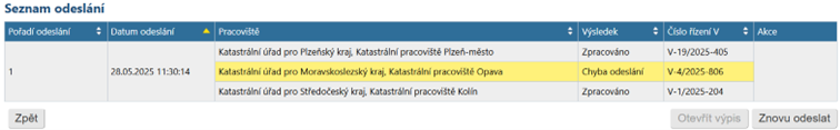 2.Výpis se podařilo úspěšně odeslat aspoň na jedno KP, kam mělo být odesláno. Vzhledem k tomu, že tímto bylo založeno aspoň jedno řízení, není možné výpis měnit a v aplikaci je rovněž uzamčen. Opět je možné stáhnout dokumenty PDF a informaci o odeslání. U ostatních KP, u kterých je ve výsledné tabulce (Seznam odeslání) uvedeno "Chyba odeslání" (záznamy jsou barevně odlišeny), se můžete rozhodnout, zda se pokusíte odeslat výpis znovu (tlačítko Znovu odeslat odesílá samozřejmě pouze na ta KP, na která se odeslat dosud nepodařilo), nebo jestli odešlete výpis spolu s příslušnými přílohami na KP pomocí datové schránky (dále jen DS).