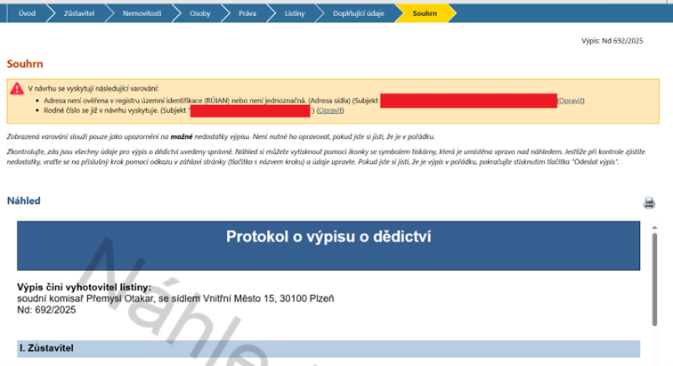 Při přechodu na tento krok probíhá ověřování všech zadaných údajů a kontrola, zda jsou splněny podmínky, které jsou nutné pro podání výpisu o dědictví. Pokud je v návrhu chyba, která brání zaslání výpisu, je na to uživatel upozorněn a musí návrh opravit, jinak není možné výpis odeslat.