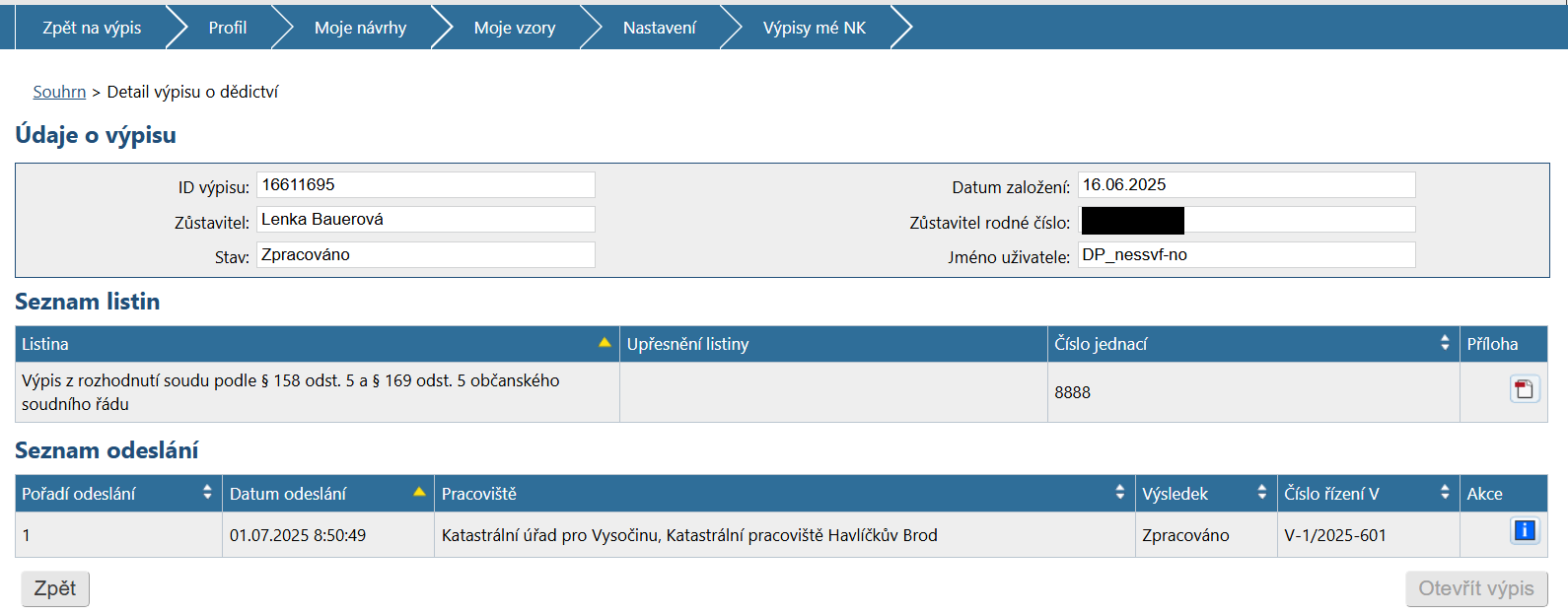 Ať už odeslání dopadne jakkoliv, po pokusu o odeslání se Vám zobrazí stránka s detailem výpisu.