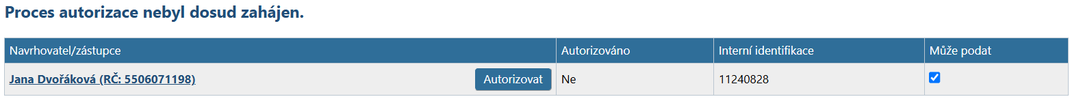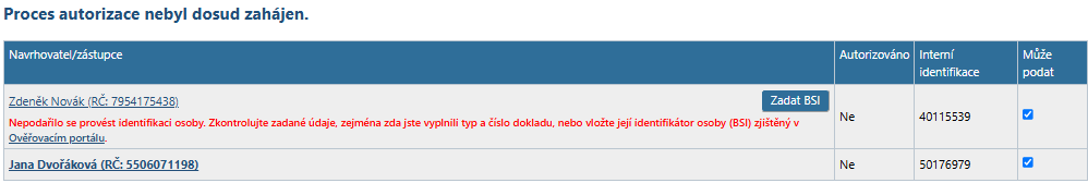 Nad tabulkou je popis stavu autorizace, v našem případě dosud nebyl proces autorizace zahájen. Návrh má dva navrhovatele/zástupce, prvním je Jana Dvořáková, která je systémem identifikována (v tomto případě je to tím, že v návrhu zvolila při přidávání účastníků "Přidat sebe"), druhým je Zdeněk Novák, kterého ovšem aplikace neidentifikovala a je nutné údaje doplnit. Buď opravou údajů v kroku "Účastníci" (jde-li například o překlep), kam se dostanu kliknutím na jméno navrhovatele/zástupce, nebo zadáním identifikátoru BSI.
