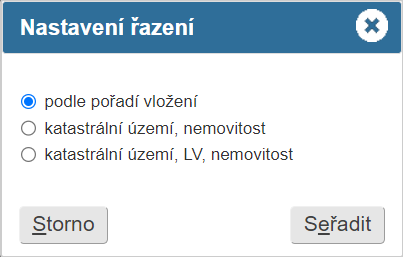-"katastrální území, LV, nemovitost" - ve sloupečku „Nemovitost“ i výběrovém seznamu "Přidat nemovitosti" se nemovitosti budou řadit podle katastrálního území, následně podle čísla listu vlastnictví a následně podle typu a označení nemovitosti (tzn. nemovitosti budou seskupeny podle LV).