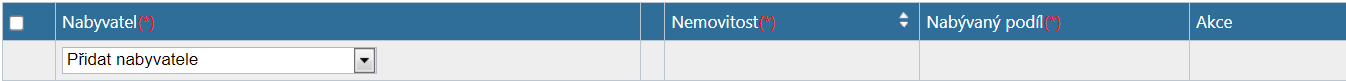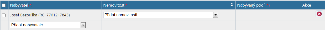 Ve sloupečku "Nabyvatel" se objeví vybraný účastník, ve sloupečku "Nemovitost" se objeví nový rozbalovací seznam pro výběr nemovitosti, ke které má nabýt vybraný účastník vlastnické právo.