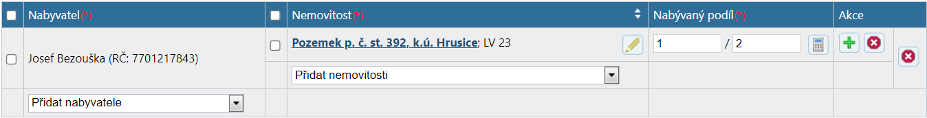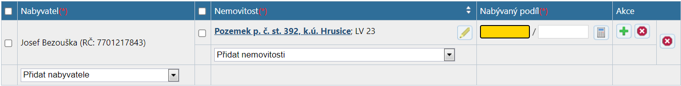 Ve sloupečku "Nemovitost" se objeví vybraná nemovitost a ve sloupečku "Nabývaný podíl" se zpřístupní textová pole pro zadání konkrétního podílu na nemovitosti, který nabyvatel získává.