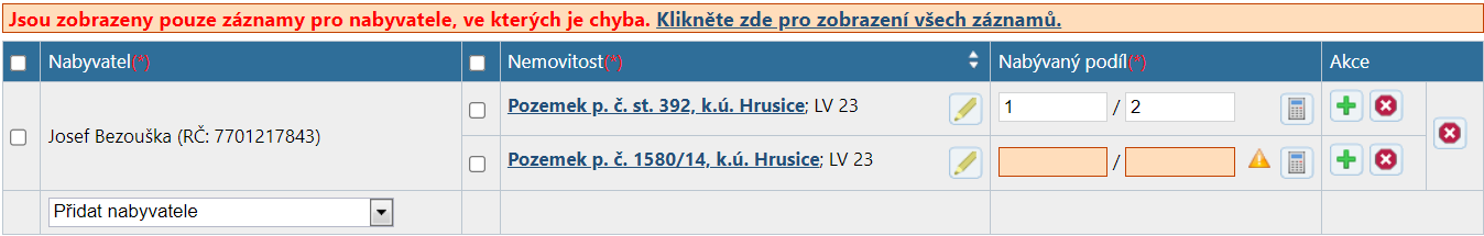 Nad tabulkou je výrazné upozornění, že tabulka obsahuje pouze ty záznamy pro nabyvatele, které obsahují nějakou chybu. Navíc je v záhlaví stránky uveden ještě celkový seznam chyb (na výše uvedeném obrázku není seznam zobrazen). Chyby můžete v tabulce rovnou opravit. Pokud chcete pokračovat v přidávání dalších podílů, můžete se buď přepnout do kompletního pohledu kliknutím na odkaz "Klikněte zde pro zobrazení všech záznamů.", nebo můžete přidat dalšího nabyvatele přímo v této tabulce a pohled se automaticky přepne na kompletní.