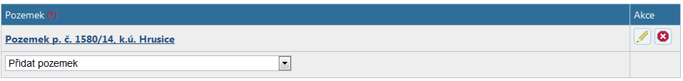 ve sloupečku "Akce" slouží k tomu, abyste mohli změnit pozemek i jinak, než tím, že řádek vymažete a nahradíte novým. Po kliknutí na ikonu se na řádku opět objeví rozbalovací seznam se seznamem pozemků a můžete vybrat jinou.