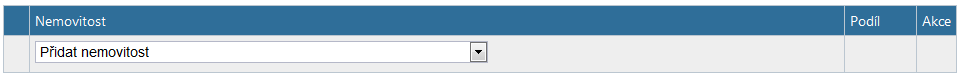 Tabulka pro zadávání zatížených nemovitostí umožňuje přidat nemovitost výběrem z rozbalovacího seznamu, ve kterém jsou všechny nemovitosti ze seznamu nemovitostí kromě těch, které jsou již do této tabulky přidány.