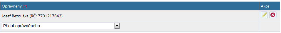 ve sloupečku "Akce" slouží k tomu, abyste mohli změnit oprávněnou osobu i jinak, než tím, že řádek vymažete a nahradíte novým. Po kliknutí na ikonu se na řádku opět objeví rozbalovací seznam se seznamem účastníků a můžete vybrat jiný subjekt.