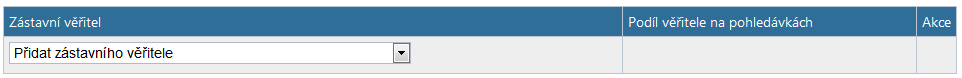 Tabulka pro zadávání věřitelů umožňuje přidat věřitele výběrem z rozbalovacího seznamu, ve kterém jsou všichni účastníci ze seznamu účastníků kromě těch, kteří jsou již do této tabulky přidáni. Na následujících obrázcích je uveden příklad tabulky pro zástavní věřitele.
