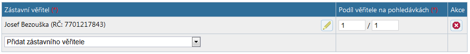 Po přidání věřitele se zpřístupní pole pro zadání podílu konkrétního věřitele na všech pohledávkách uvedených v tabulce pohledávek. Pokud mají věřitelé různý podíl na jednotlivých pohledávkách, je nutné založit více zástavních práv - pro každou pohledávku, kde se podíl liší, jedno právo.