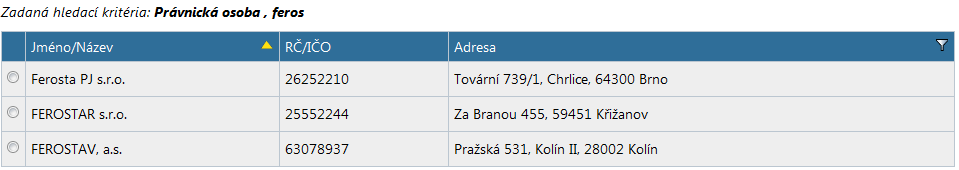 Nalezené subjekty, které vyhovují zadaným podmínkám, jsou zobrazeny v tabulce. Těsně nad tabulkou jsou uvedeny údaje, na základě kterých byly zobrazené subjekty vyhledány. Tato informace je užitečná tehdy, když změníte údaje týkající se vyhledávacích kritérií a ještě jste nestiskli Vyhledat subjekty. Údaje v tabulce se totiž zachovávají do té doby, dokud tlačítko Vyhledat subjekty nestisknete znovu. Pokud si přepíšete vyhledávací kritéria, nevíte pak, na základě čeho byly údaje v tabulce nalezeny.