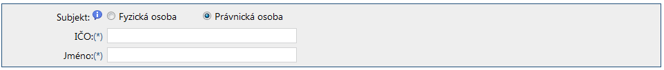Při vyhledávání subjektů - právnických osob stačí zadat buď její IČO nebo počáteční písmena názvu právnické osoby. Při zadávání názvu nemusíte dodržovat velká písmena ani diakritiku (háčky a čárky). Samozřejmě je možné zadat zároveň IČO a název.