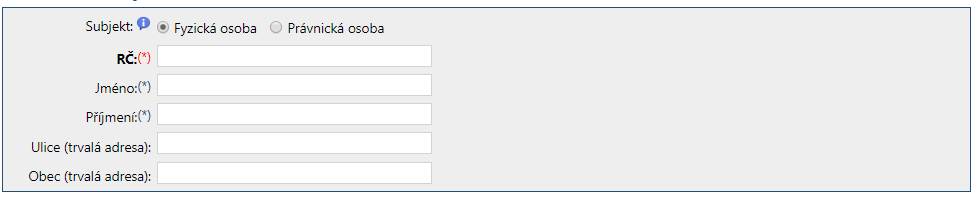 Při vyhledávání subjektů - fyzických osob je nutné zadat minimálně buď rodné číslo a jméno, nebo rodné číslo a příjmení. Při zadávání textů nemusíte dodržovat velká písmena ani diakritiku (háčky a čárky). Musíte ale zadat jméno i příjmení celé. Samozřejmě je možné zadat zároveň RČ, jméno a příjmení.
