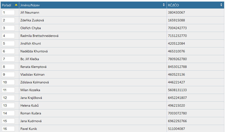 Jakmile změníte pořadí jednotlivých účastníků a stisknete tlačítko Uložit a zavřít, zobrazuje se seznam účastníků ve zvoleném pořadí a ve stejném pořadí se pak účastníci objeví ve výsledném souboru s návrhem na vklad.