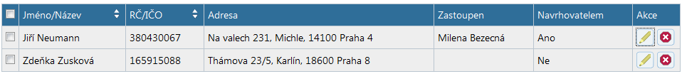 Jestliže máte stejný subjekt v seznamu účastníků i seznamu zástupců, fungují výše uvedená tlačítka vždy nezávisle pro obě uvedené tabulky. Smažete-li subjekt v účastnících, subjekt nadále zůstává v seznamu zástupců a naopak.