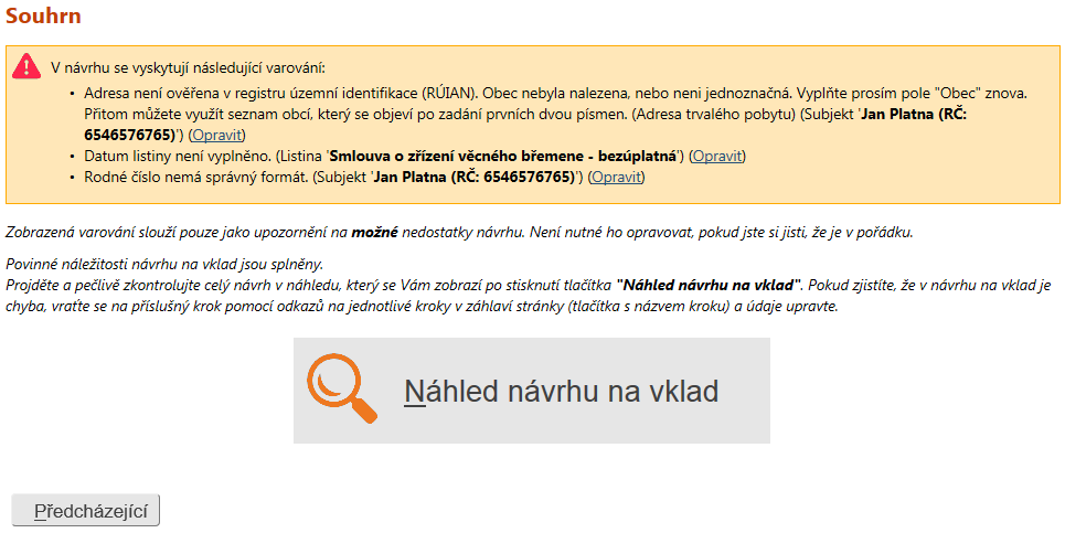 Navíc může nastat situace, kdy některé Vámi vyplněné hodnoty jsou v rozporu s požadavky platné právní úpravy. Z tohoto důvodu, a také jako upozornění na zadané, případně nezadané, údaje v některých nepovinně vyplňovaných polích, jsou v tomto případě v horní části stránky zobrazena jednotlivá varování upozorňující na možné nesrovnalosti. Samotná varování nejsou překážkou k dokončení návrhu a k vygenerování dokumentu (souboru PDF) s návrhem, který je možno podat na příslušné katastrální pracoviště.