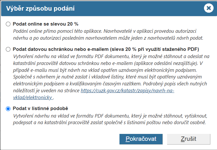 Při volbě "Podat datovou schránkou nebo e-mailem" nebo "Podat v listinné podobě" se aplikace chová stejně, jako tomu bylo v předchozích verzích, kde ještě nebyl možnost podat návrh online: po stisknutí tlačítka Pokračovat se místo náhledu objeví instrukce pro podání návrhu a nad nimi tlačítko Stáhnout návrh na vklad (PDF formát). Toto tlačítko pak slouží ke stažení (případně otevření) výsledného návrhu na vklad. Soubor si můžete uložit do svého počítače podle pokynů prohlížeče, který k návrhu používáte.