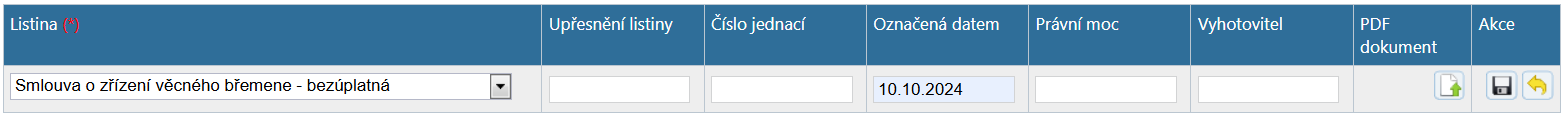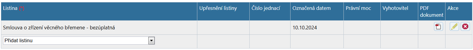 Sloupeček "Označená datem" není povinný, ale je vhodné do něj napsat datum, které je uvedeno na listině. Může to být například datum uzavření smlouvy (tj. datum podpisu posledního účastníka) apod. Tato informace může sloužit k identifikaci listiny, která je k návrhu přiložena, pokud je jich více. Do sloupečků "Právní moc" a "Vyhotovitel" můžete vyplnit datum právní moci listiny a jejího zhotovitele, tato pole nejsou povinná. Pokud je vyplněno "Označená datem" i datum právní moci, pak se při ukládání údajů o listině kontroluje, zda datum právní moci následuje až po datu uvedeném ve sloupci "Označená datem", případně data mohou být stejná.