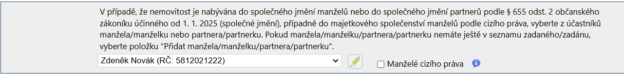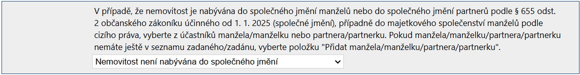 Pokud potřebujete partnery oddělit, vyberte z rozbalovacího seznamu položku "Nemovitost není nabývána do společného jmění".