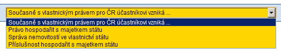 V případě, kdy je účastníkem řízení (jehož předmětem je vlastnické právo) státní organizace nebo organizační složka státu, stává se vlastníkem nemovitostí Česká republika. Pro účastníka řízení zmíněného typu je pak nutné zadat typ práva, které mu zároveň s převodem nemovitosti na ČR vzniká. K dispozici jsou tři možnosti, které jsou zobrazeny na následujícím obrázku. Vyberte odpovídající typ.