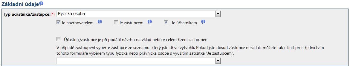 Pokud je subjekt označen jako navrhovatel nebo zástupce, zpřístupní se možnost vybrat zástupce (pro účastníka, který není navrhovatelem nemá zástupce smysl).