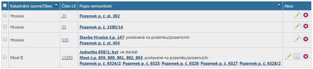 ve sloupečku „Akce“ slouží k editaci údajů o nemovitosti, pokud se jedná o novou nebo dosud nezapsanou nemovitost, nebo k náhledu na detail údajů o nemovitosti, pokud se jedná o nemovitost, která je už v katastru evidována. Údaje k nemovitosti vedené v katastru není možné upravovat.