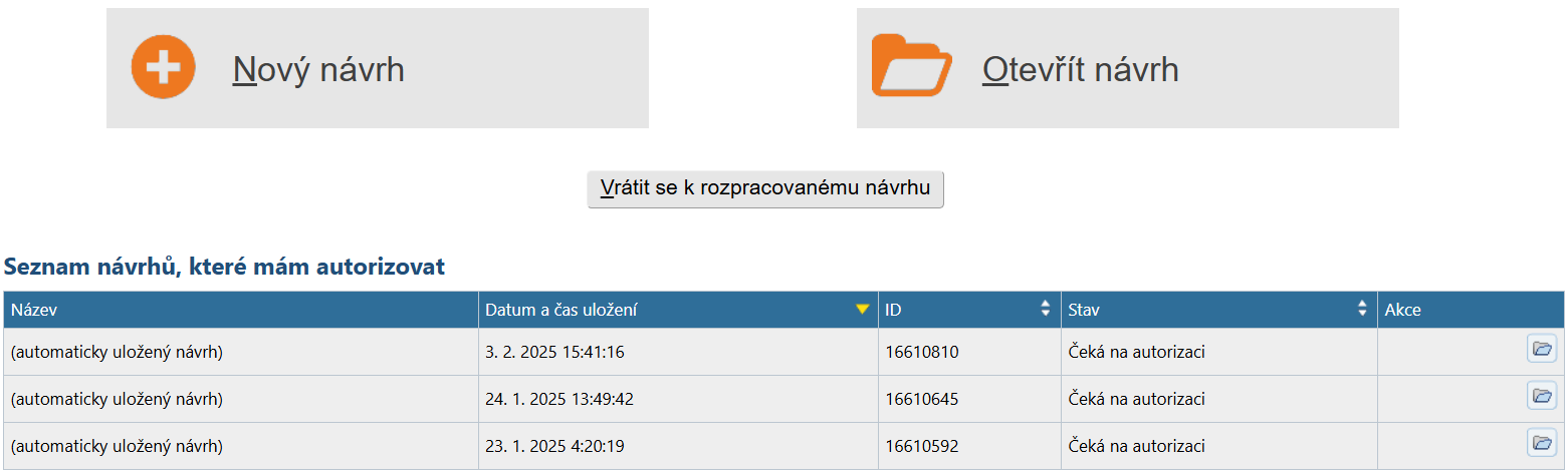 Ve spodní části se uživateli, který je přihlášen pomocí Identity občana, zobrazuje tabulka se seznamem návrhů, které čekají na autorizaci právě přihlášeným uživatelem. Kliknutím na ikonu v pravé části tabulky lze návrh otevřít a autorizaci provést. Pokud žádný návrh na autorizaci uživatelem nečeká, nebo je uživatel přihlášen jako uživatel Dálkového přístupu do KN, tabulka se nezobrazuje.