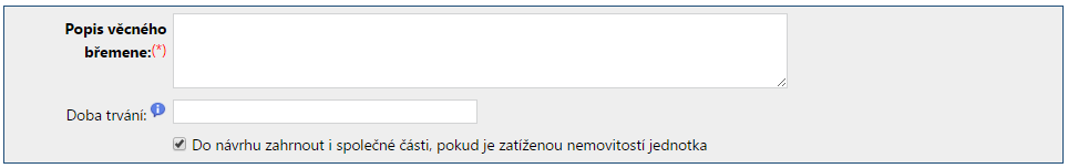 Označovací pole "Do návrhu zahrnout i společné části, pokud je zatíženou nemovitostí jednotka" slouží k tomu, abyste mohli ovlivnit vložení společných částí jednotky (pokud jsou mezi zatíženými nemovitostmi) do návrhu pro vklad věcného břemene. Odškrtnutím políčka zajistíte, že společné části jednotky v návrhu nebudou, necháte-li políčko zaškrtnuté, bude se vklad týkat jak samotné jednotky, tak i jejích společných částí.