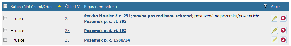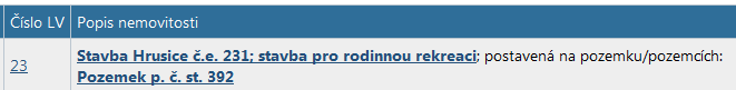V seznamu nemovitostí, a ve všech dalších tabulkách, kde se pracuje s nemovitostmi, můžete vidět modré podtržené texty. Tyto texty jsou odkazy na aplikaci Nahlížení do katastru, a pokud na odkaz kliknete myší (nebo stisknete klávesu ENTER na odkazu, který má fokus), zobrazí se Vám detailní informace o objektu (o nemovitosti nebo o čísle LV).